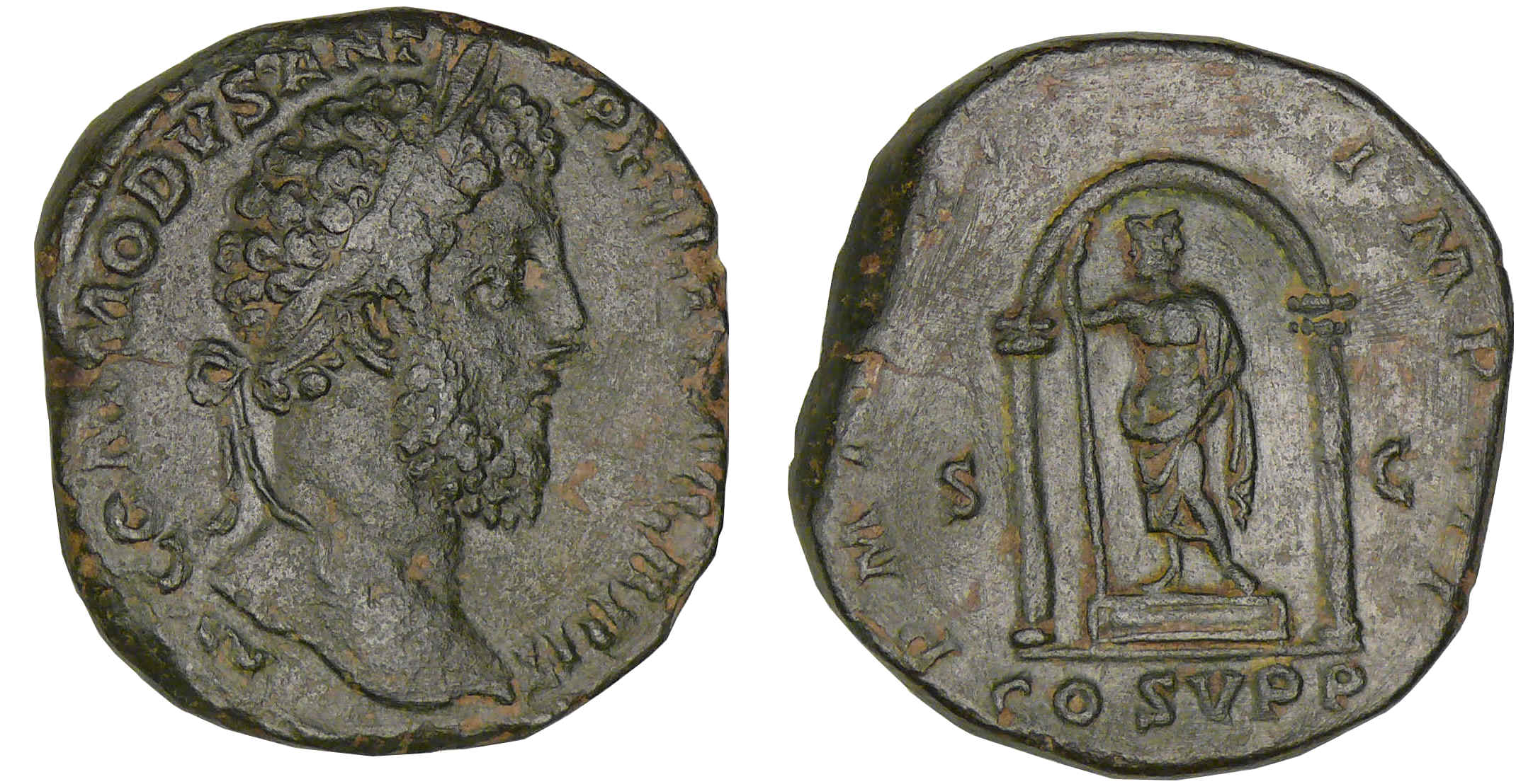 Avers : A/ M COMMODVS ANT P FELIX AVG BRIT. Buste lauré à droite.