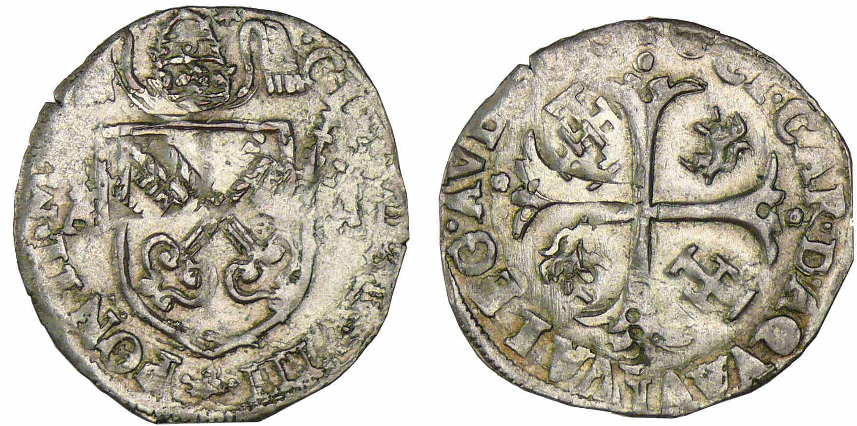 Clément VIII (1592-1605). A/ CLEMENS VIII PONTIF MAX. Ecu chargé de deux clefs en sautoir, accosté de deux A et surmonté d’une tiare.