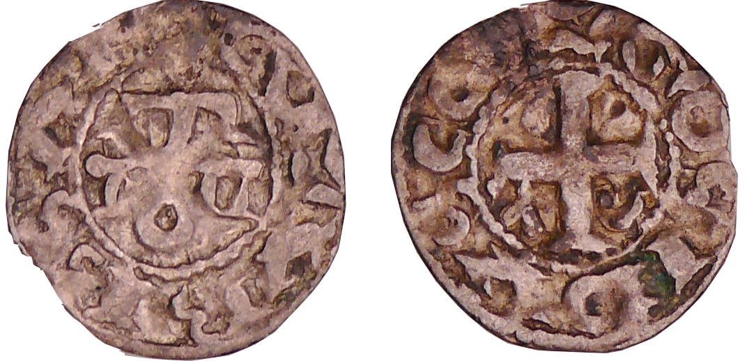 R/ + GOSFRIDVS COIS. Croix ayant un alpha et un oméga suspendus à la branche transversale.