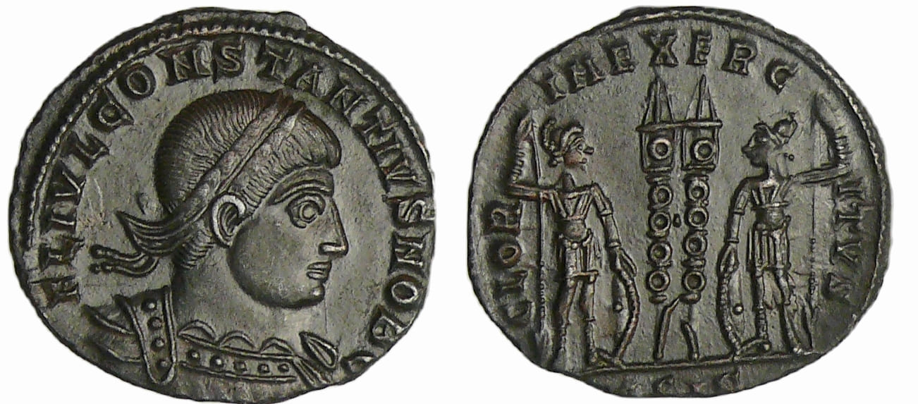 Avers : A/ FL IVL CONSTANTIVS NOB C. Buste lauré et cuirassé à droite.