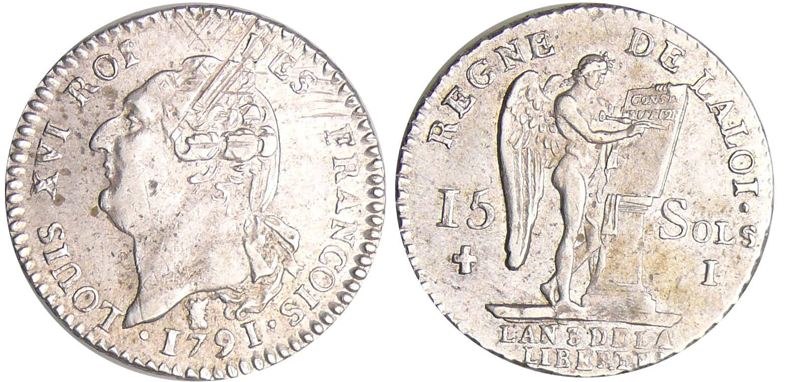/ Constitution (1791-1792) – 15 sols type FRANCOIS 1791 I (Limoges) 1er sem
