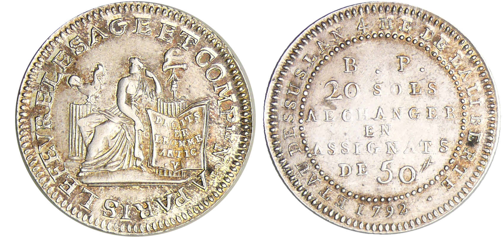 Revers : R/ ET AU DESSUS L’AN 4ME DE LA LIBERTE / 1792 au centre en 6 lignes : B. P. / 20 SOLS / A ECHANGER / EN / ASSIGNATS / DE 50#.