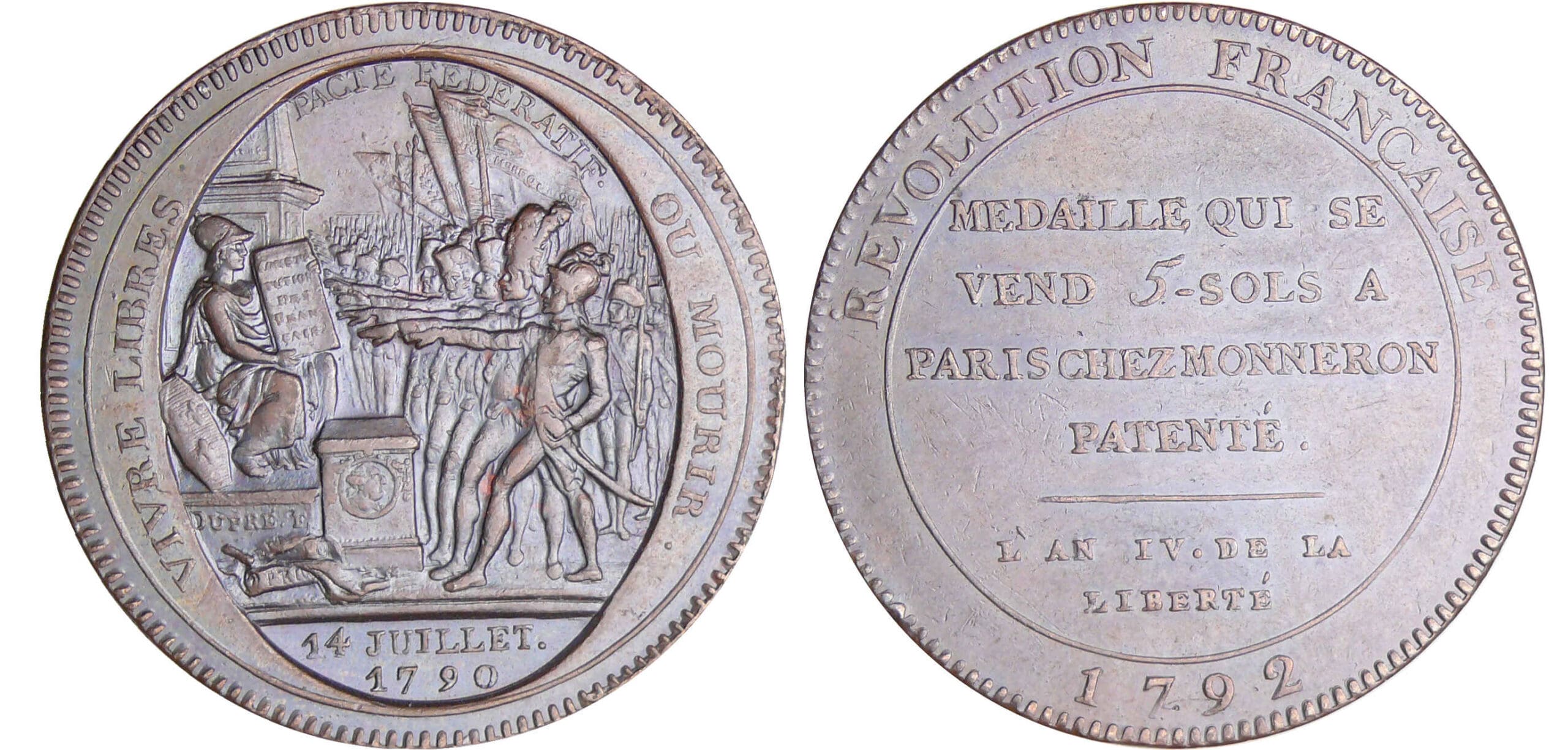 Revers : R/ MEDAILLE QUI SE / VEND 5-SOLS A / PARIS CHEZ MONNERON / PATENTÉ L’AN IV. DE LA / LIBERTÉ avec 1792 à l’exergue.
