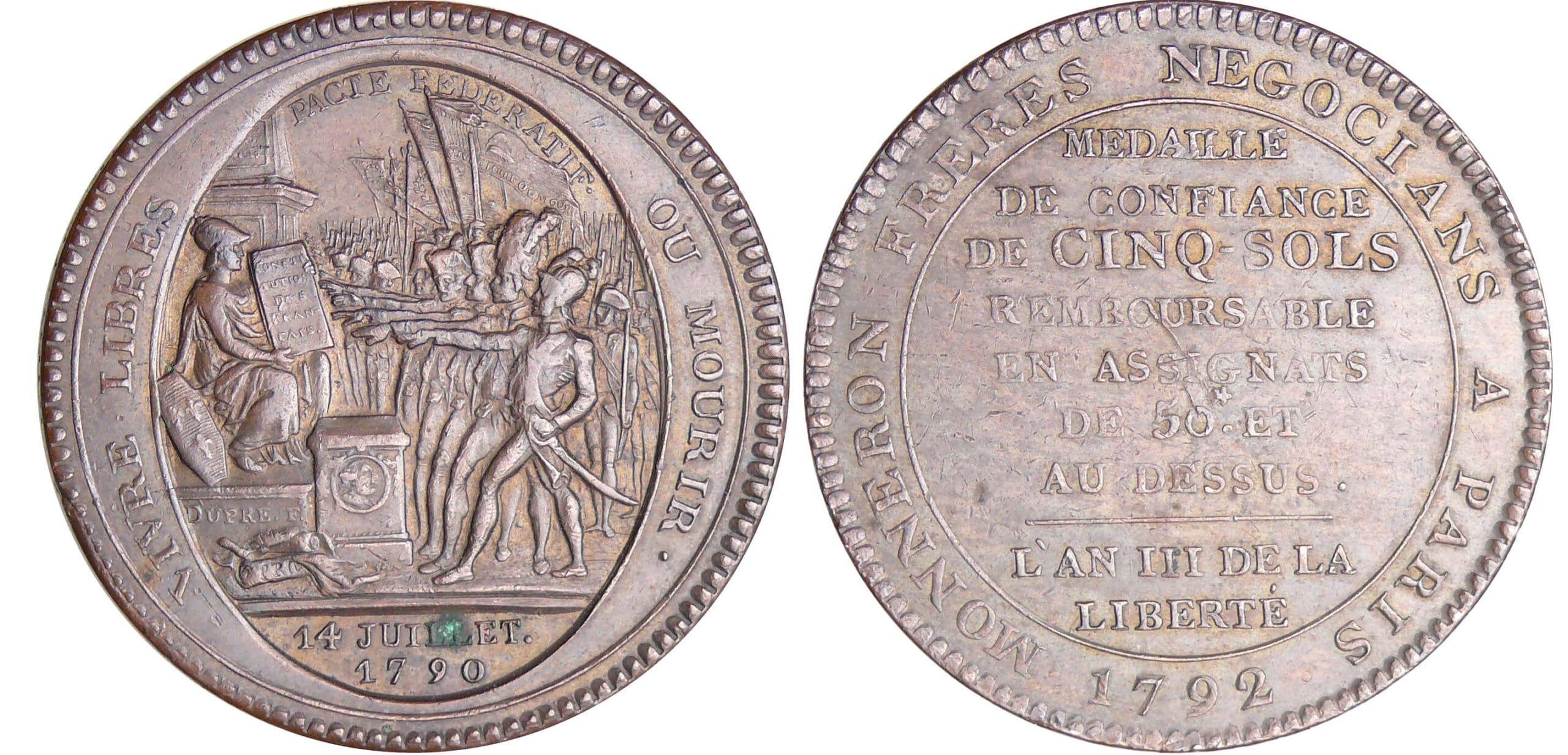 Revers : R/ MEDAILLE / DE CONFIANCE / DE CINQ SOLS / REMBOURSABLE / EN ASSIGNATS / DE 50 L ET / AU DESSUS / L’AN IV DE LA LIBERTE autour MONNERON FRERES NEGOCIANS A PARIS. Date à l’exergue 1792.
