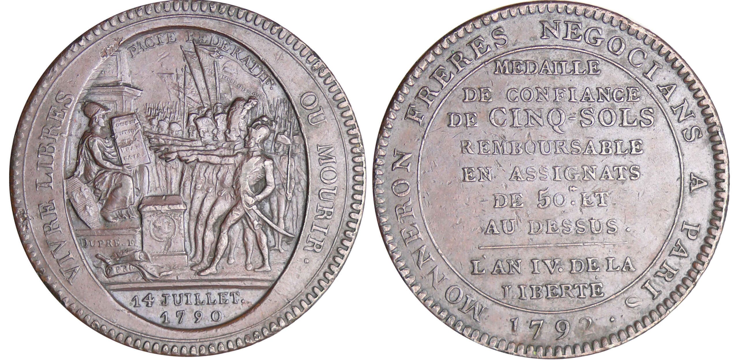 Revers : R/ MEDAILLE / DE CONFIANCE / DE CINQ SOLS / REMBOURSABLE / EN ASSIGNATS / DE 50 L ET / AU DESSUS / L’AN IV DE LA LIBERTE autour MONNERON FRERES NEGOCIANS A PARIS. Date à l’exergue 1792.