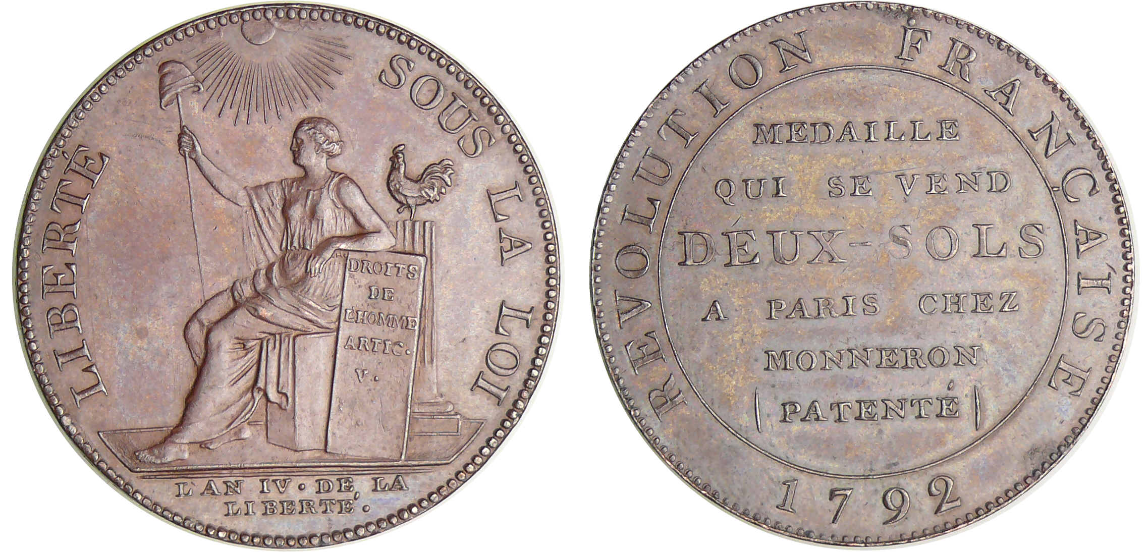 Revers : R/ REVOLUTION FRANCAISE MEDAILLE QUI SE VEND DEUX-SOLS A PARIS CHEZ MONNERON (PATENTE). Date à l’exergue 1792.