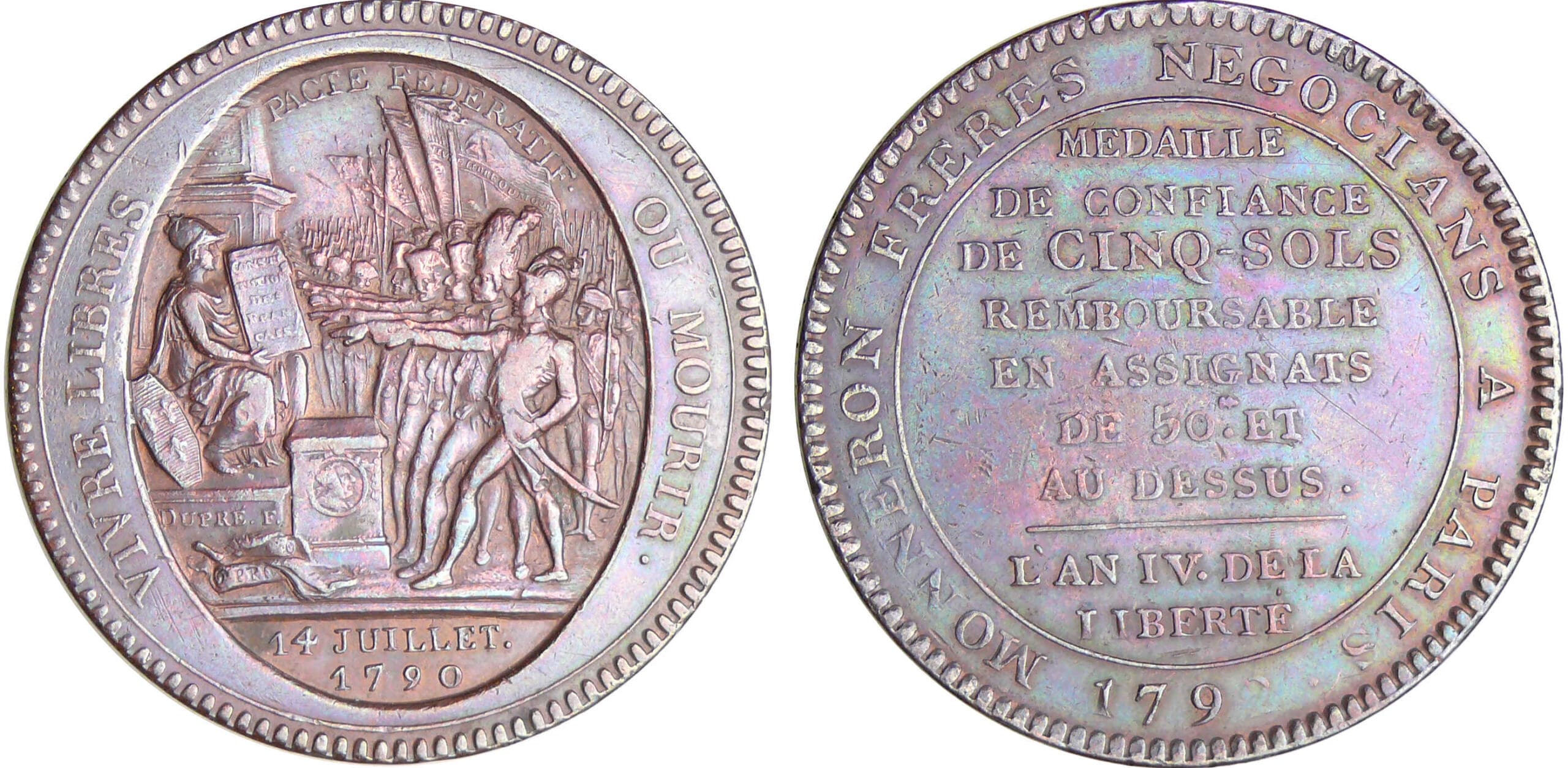 Revers : R/ MEDAILLE / DE CONFIANCE / DE CINQ SOLS / REMBOURSABLE / EN ASSIGNATS / DE 50 L ET / AU DESSUS / L’AN IV DE LA LIBERTE autour MONNERON FRERES NEGOCIANS A PARIS. Date à l’exergue 1792.