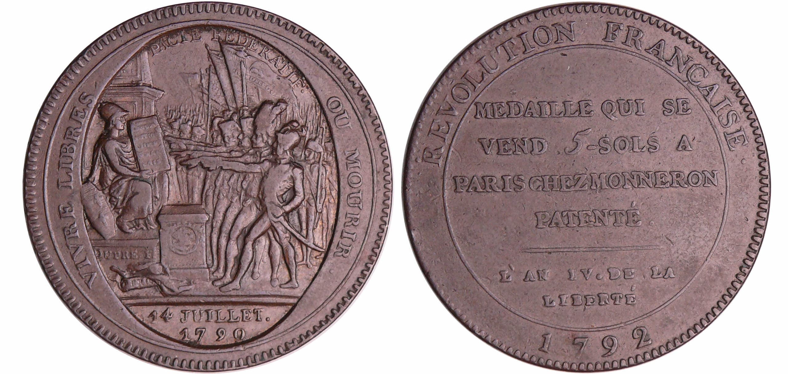 Revers : R/ MEDAILLE QUI SE / VEND 5-SOLS A / PARIS CHEZ MONNERON / PATENTÉ L’AN IV. DE LA / LIBERTÉ avec 1792 à l’exergue.