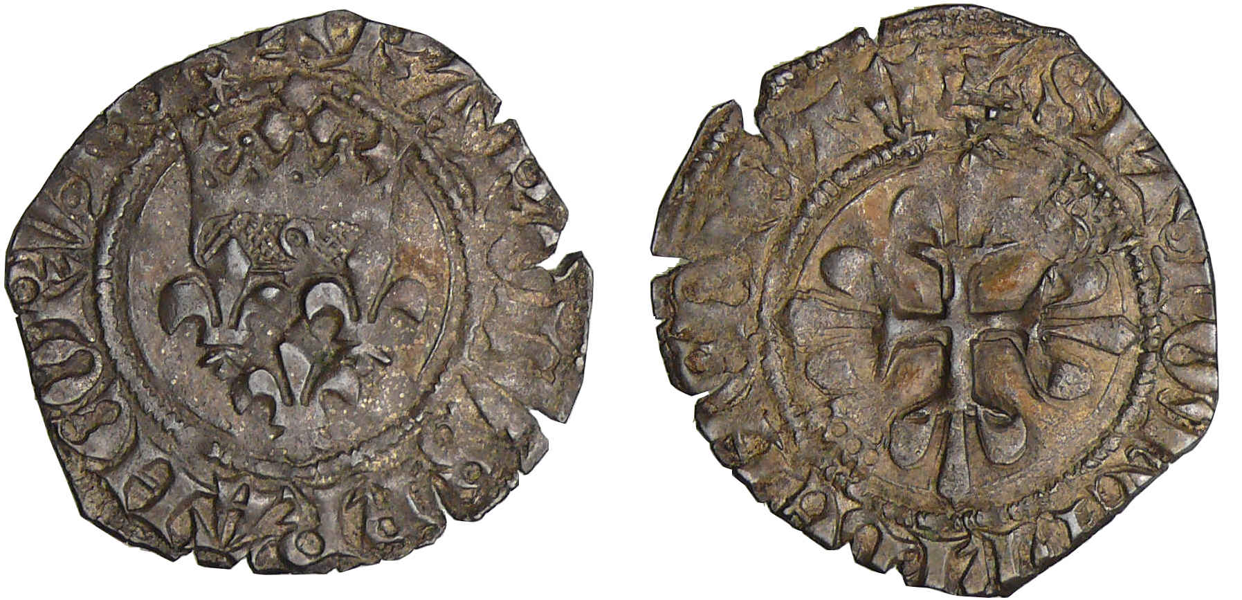 Avers : A/ + KAROLVS FRANCORVm ReX Trois lis posés aux 2ème et 1er cantons sous une couronne.