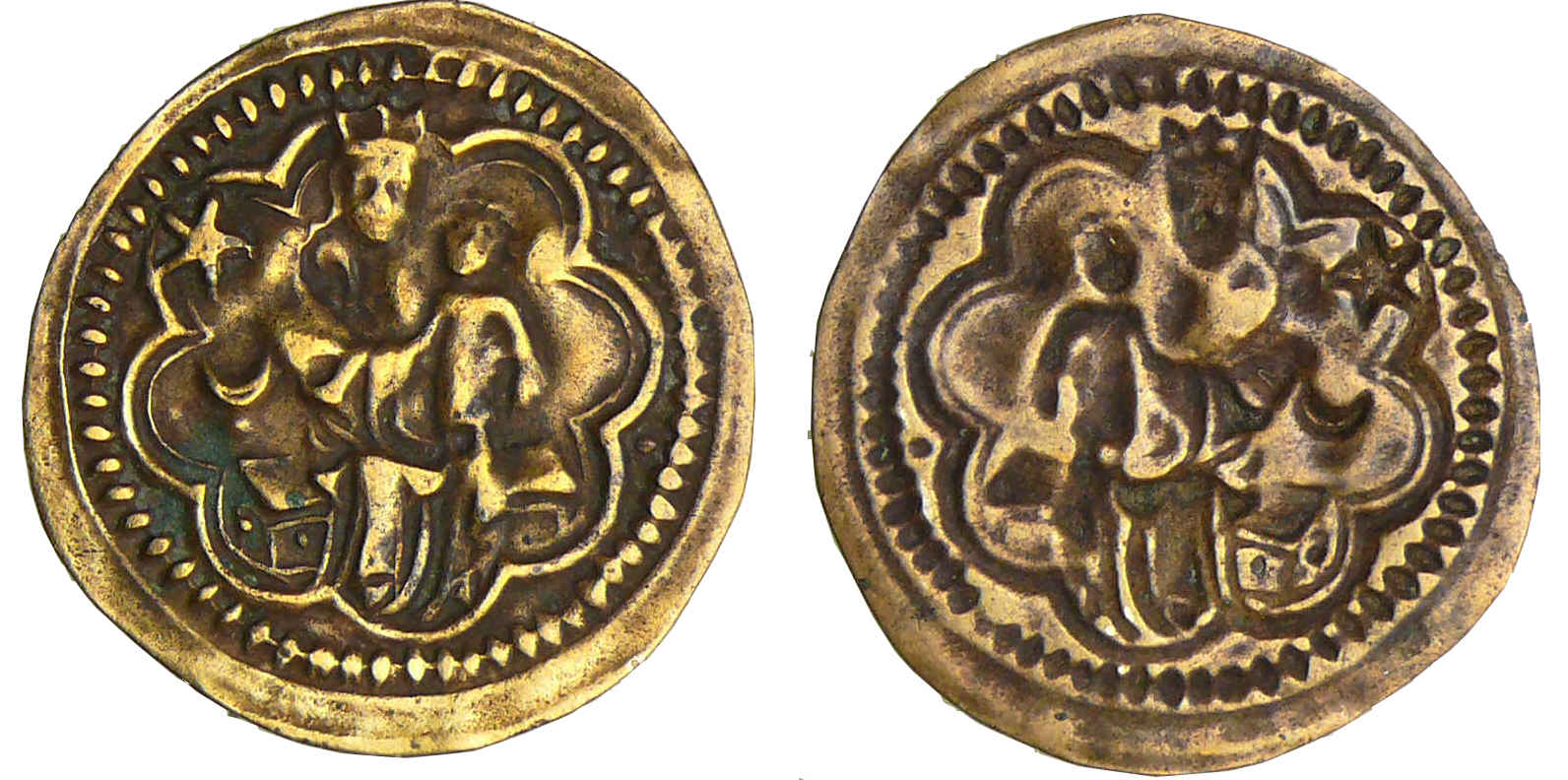 La Vierge assise de face tenant un enfant, à gauche une étoile.