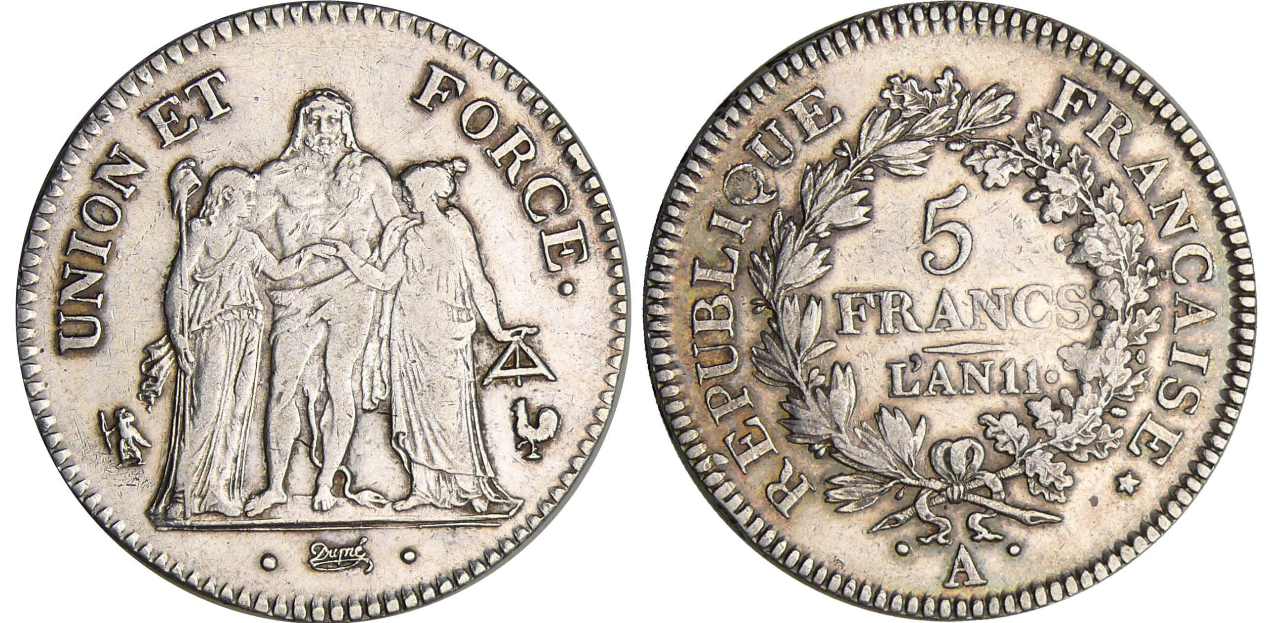 / Consulat (1799-1804) – 5 francs Hercule union et force An 11 A (Paris)
