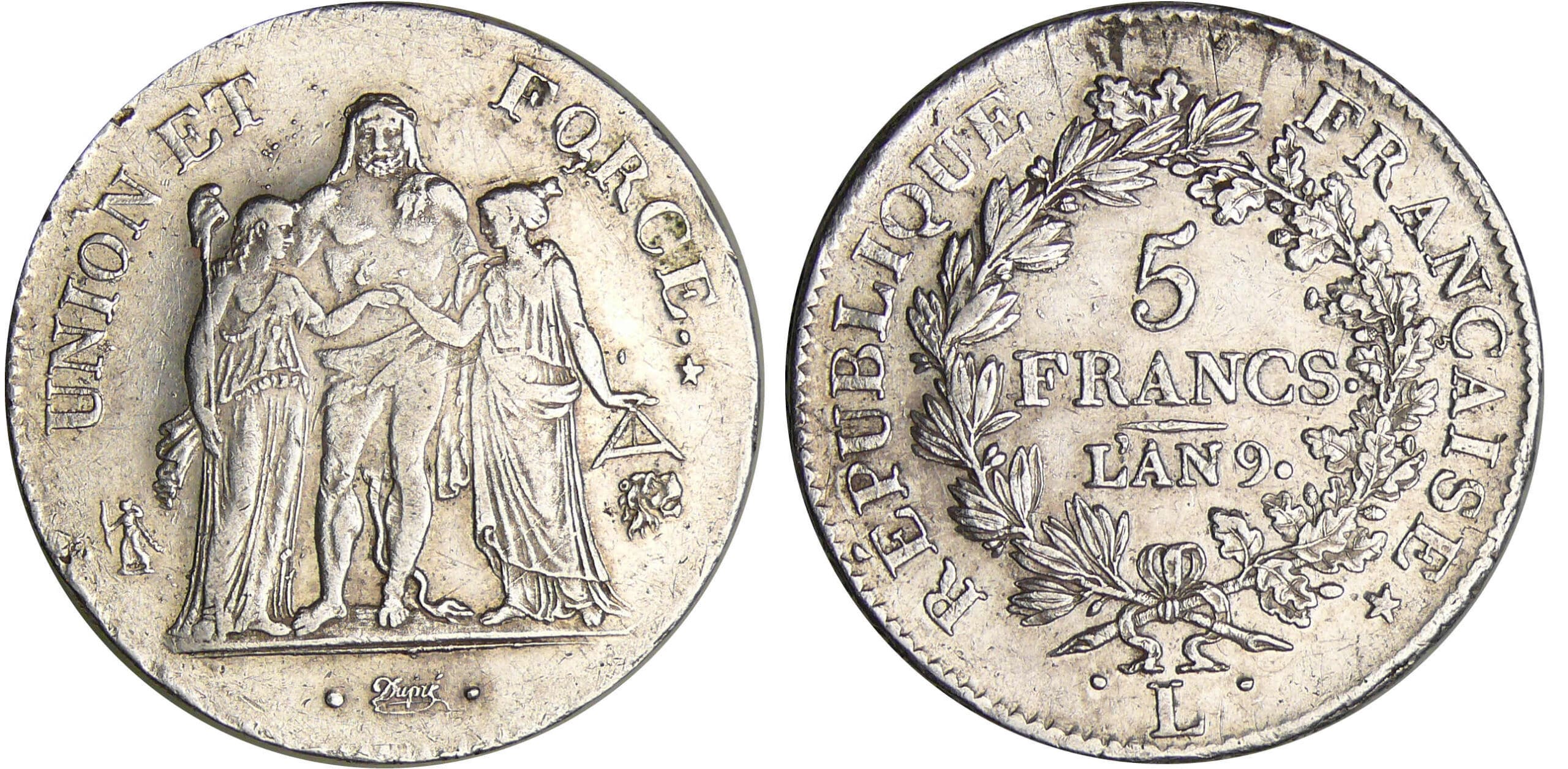 Consulat (1799-1804) – 5 francs Hercule union et force An 9 L (Bayonne)