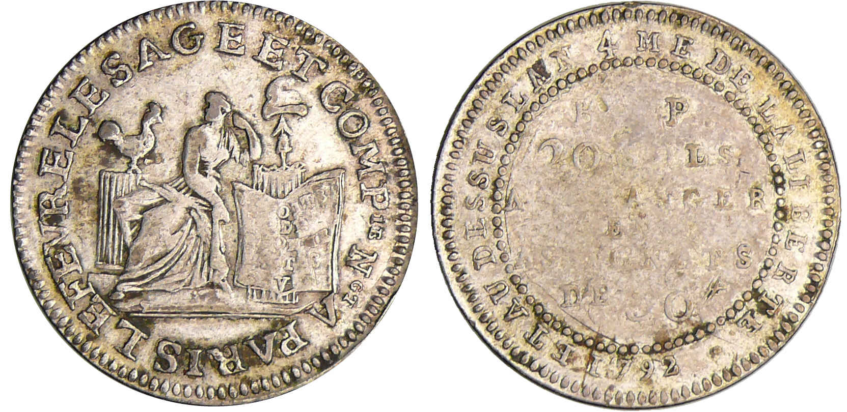 Revers : R/ ET AU DESSUS L’AN 4ME DE LA LIBERTE / 1792 au centre en 6 lignes : B. P. / 20 SOLS / A ECHANGER / EN / ASSIGNATS / DE 50#.
