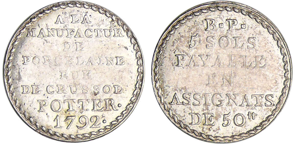 Avers : A/ A LA / MANUFACTURE / DE / PORCELAINE / RUE / DE CRUSSOL / POTTER. / 1792 en huit lignes dans le champ. Le E final.