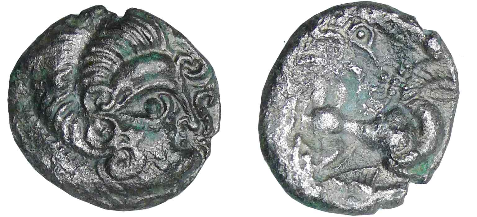 R/ Anépigraphe. Cheval androcéphale bridé, galopant à droite. Entre les jambes, une lyre.