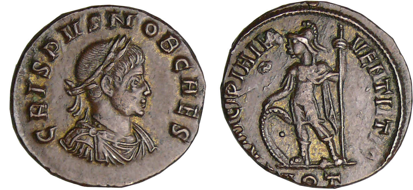 A/ CRISPVS NOB CAES Buste lauré et cuirrassé à droite.