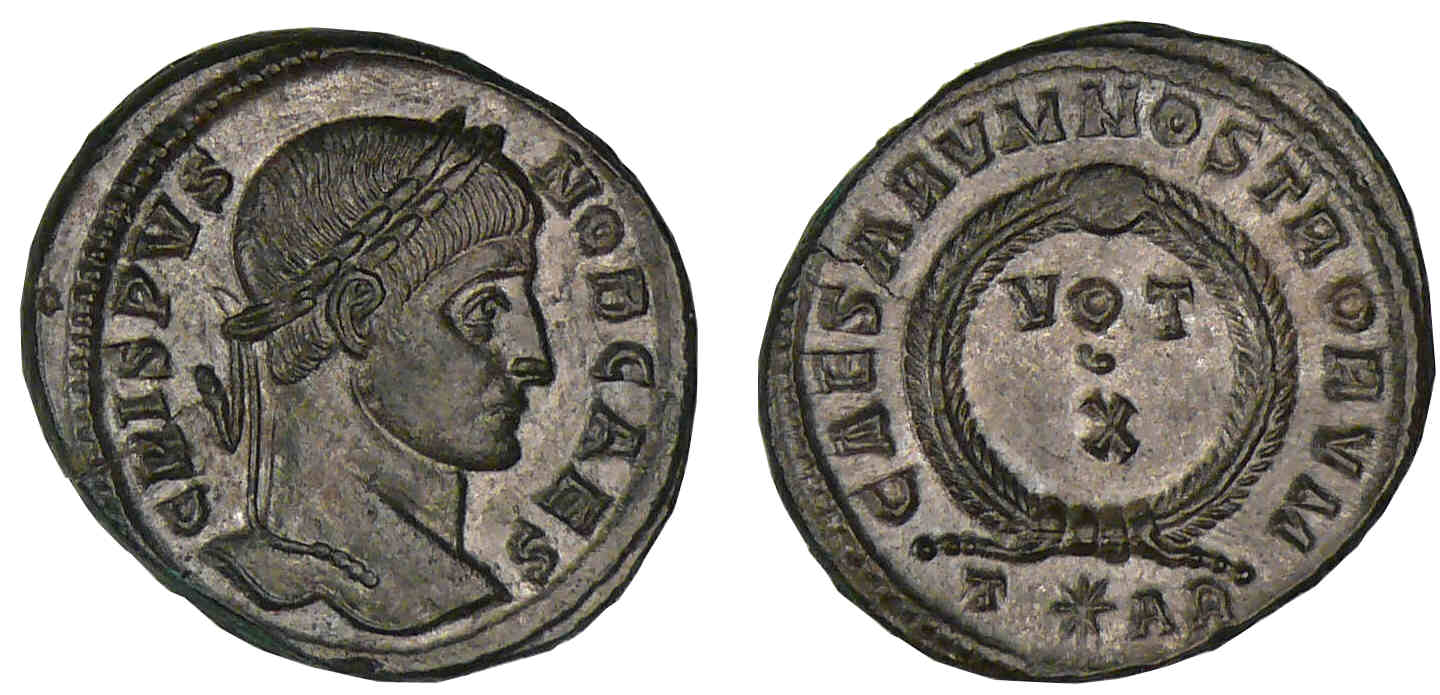 A/ CRISPVS NOB CAES. Tête laurée à droite.
