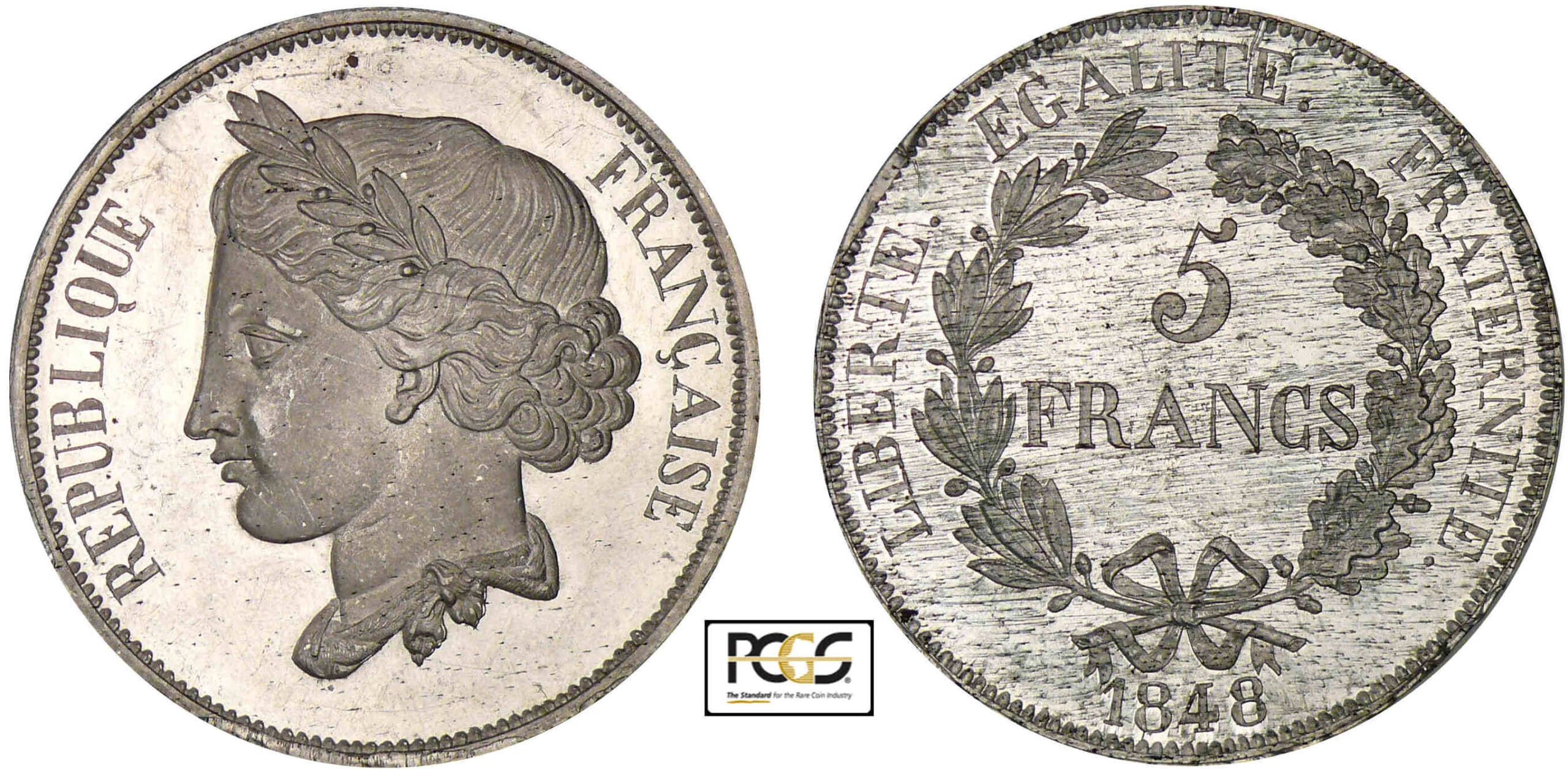 R/ LIBERTE EGALITE FRATERNITE. 5 FRANCS 1848 dans une couronne de chêne et d’olivier.