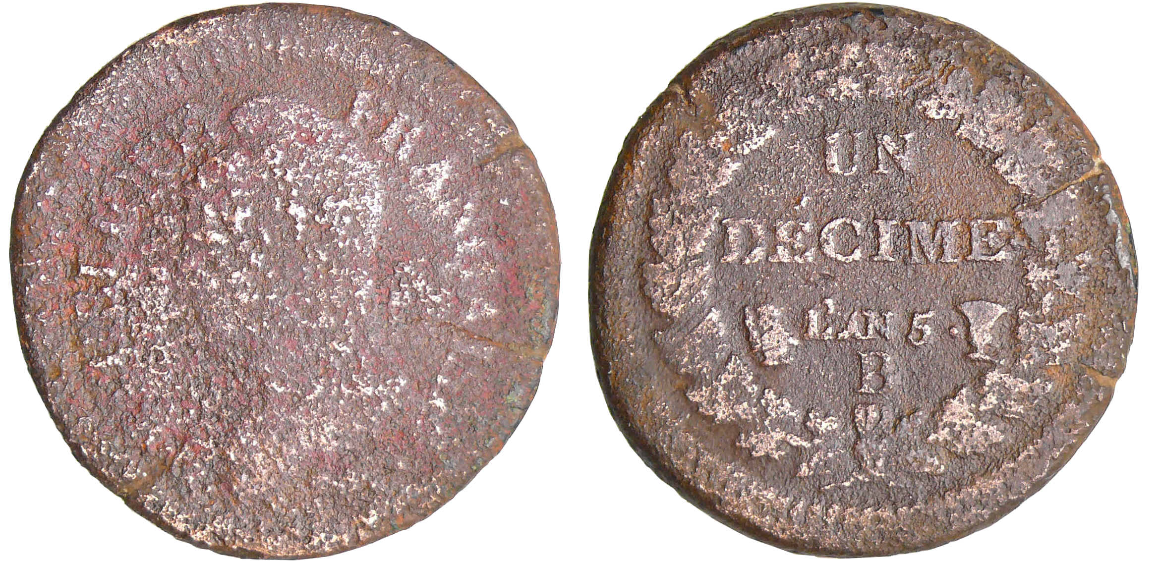 Directoire (1795-1799) – 1 décime Dupré – grand module An 5 B (Rouen) hybride revers du 5 centimes