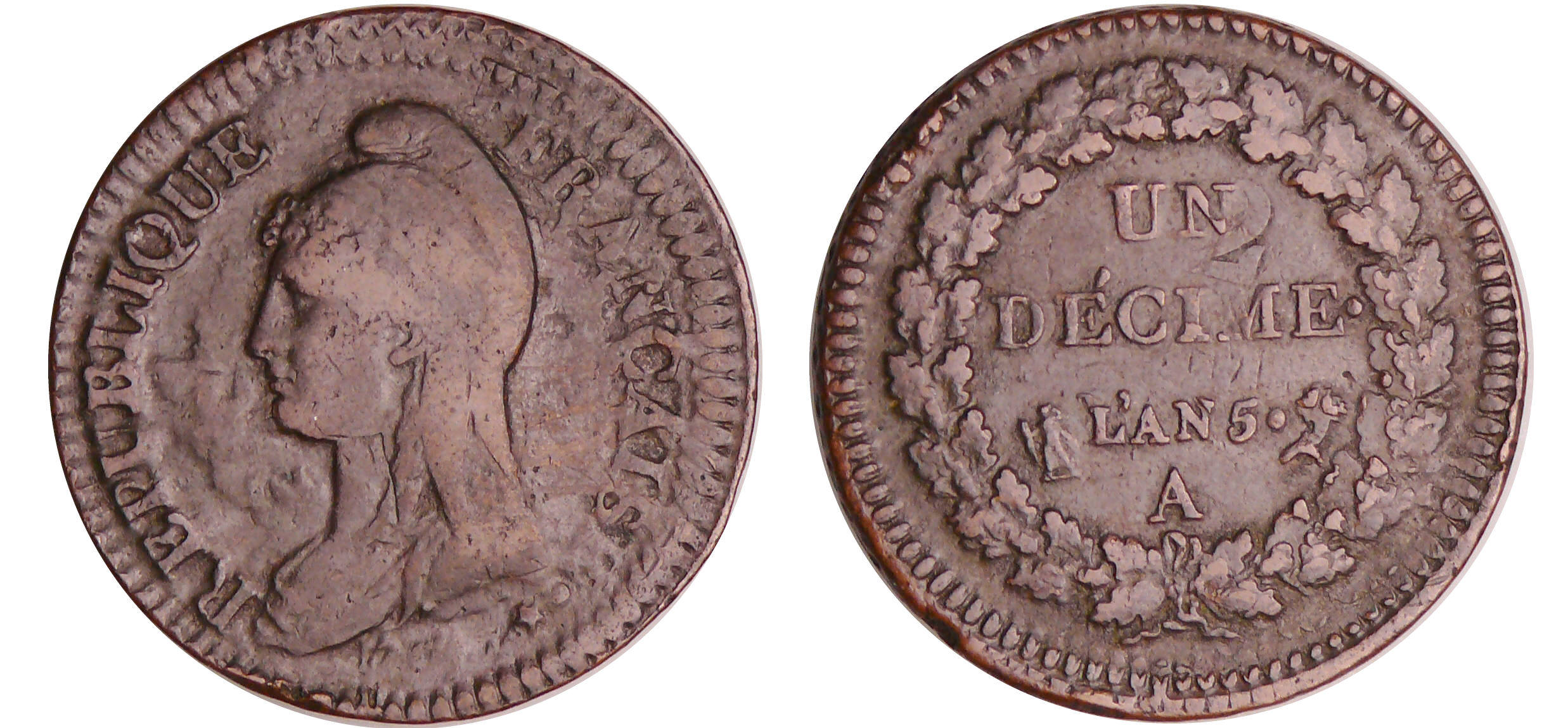 Directoire (1795-1799) – 1 décime Dupré – surfrappe du 2 décimes An 5 A (Paris)