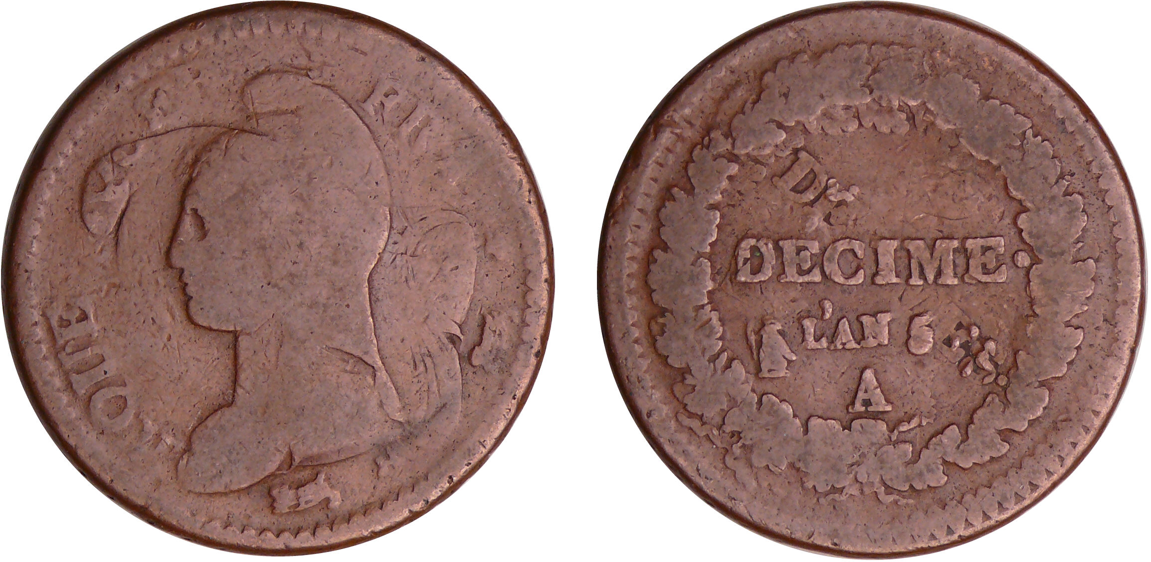 Directoire (1795-1799) – 1 décime Dupré – surfrappe du 2 décimes An 5 A (Paris)