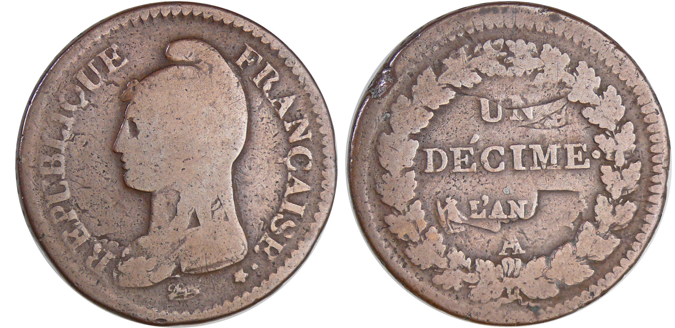 / Directoire (1795-1799) – 1 décime Dupré – surfrappe du 2 décimes An ? A (Paris)