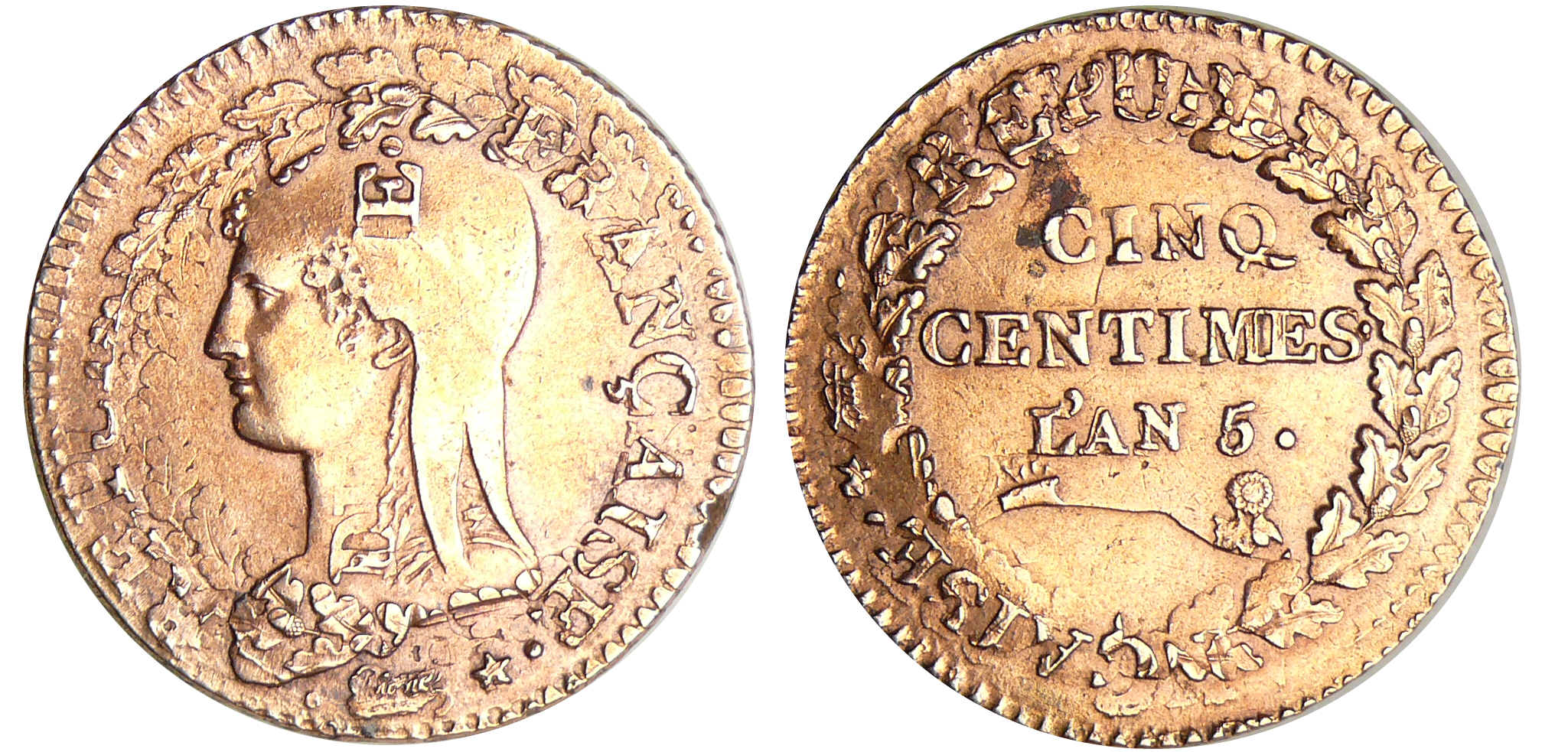 Directoire (1795-1799) – 5 centimes Dupré – surfrappe – AN 5 I (Limoges)