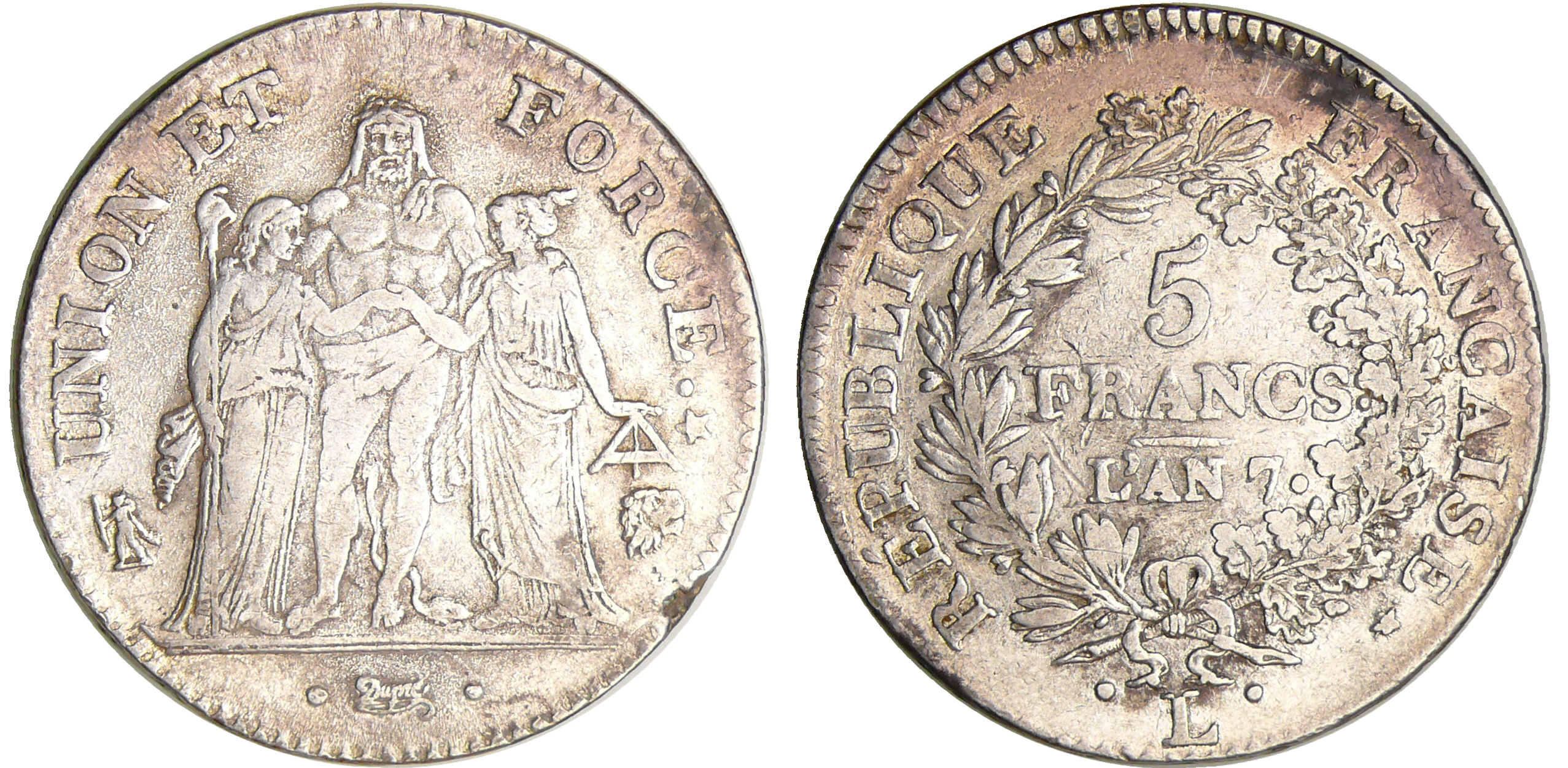 / Directoire (1795-1799) – 5 francs Hercule union et force An 7 L (Bayonne)