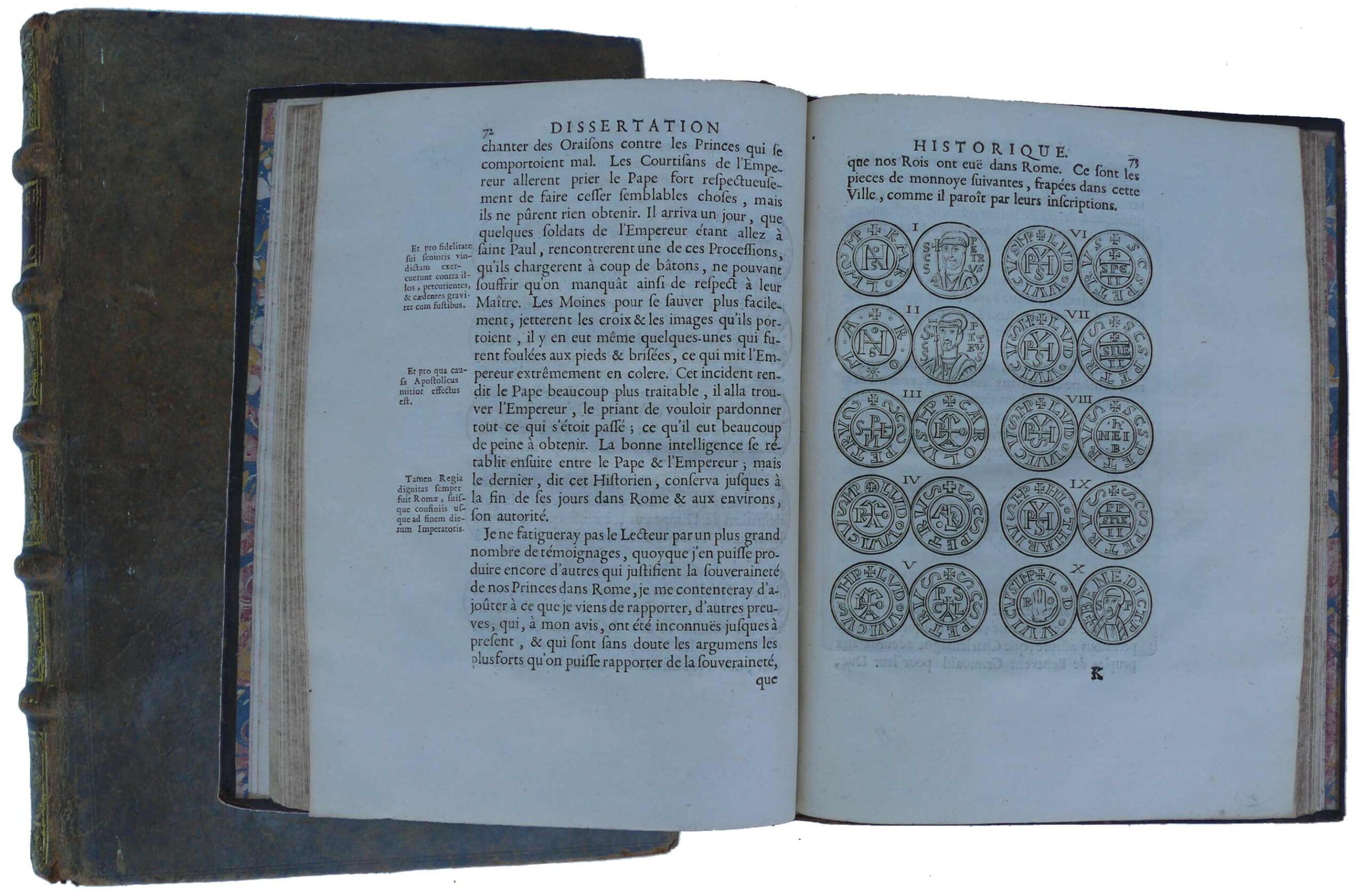 Rare ouvrage sur les monnaies carolingiennes frappées à Rome. Édition originale couverture plein cuir à 5 nerfs. 188 pages, aucune trace d’humidité.