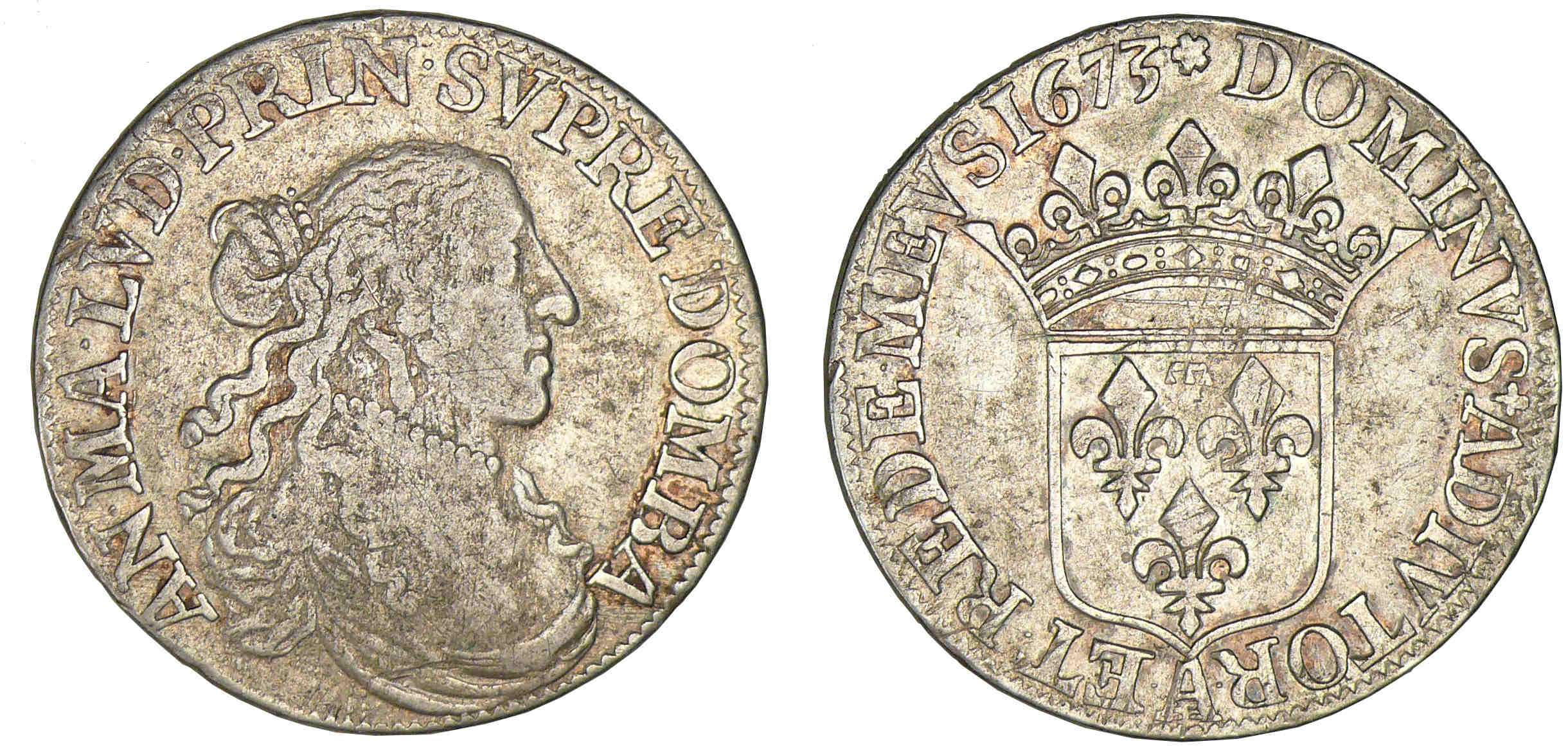 R/ DOMINVS ADIVTOR ET REDE MEVS 1673. Ecu couronné.