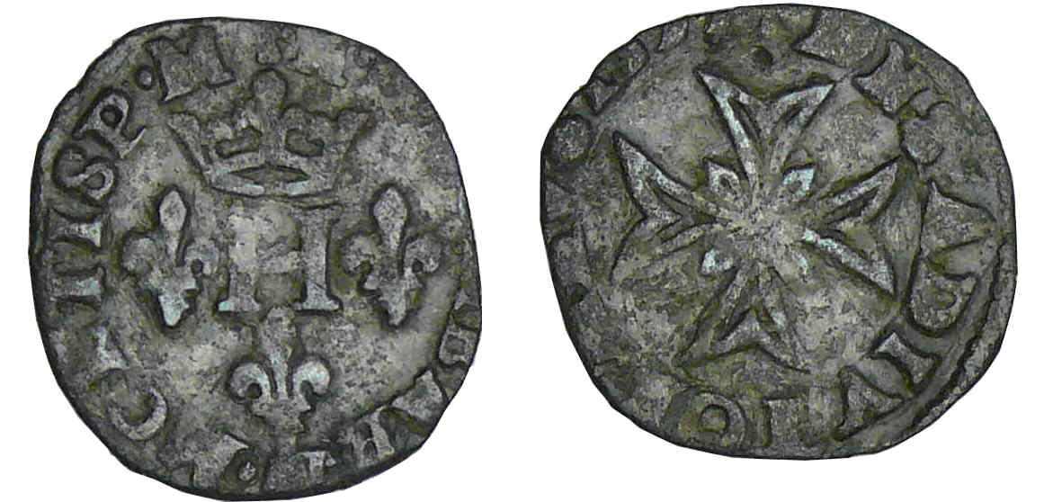 R/ + DNS ADIVT ET REDEM MEVS (millésime). Croix cantonnée de quatre couronnes.