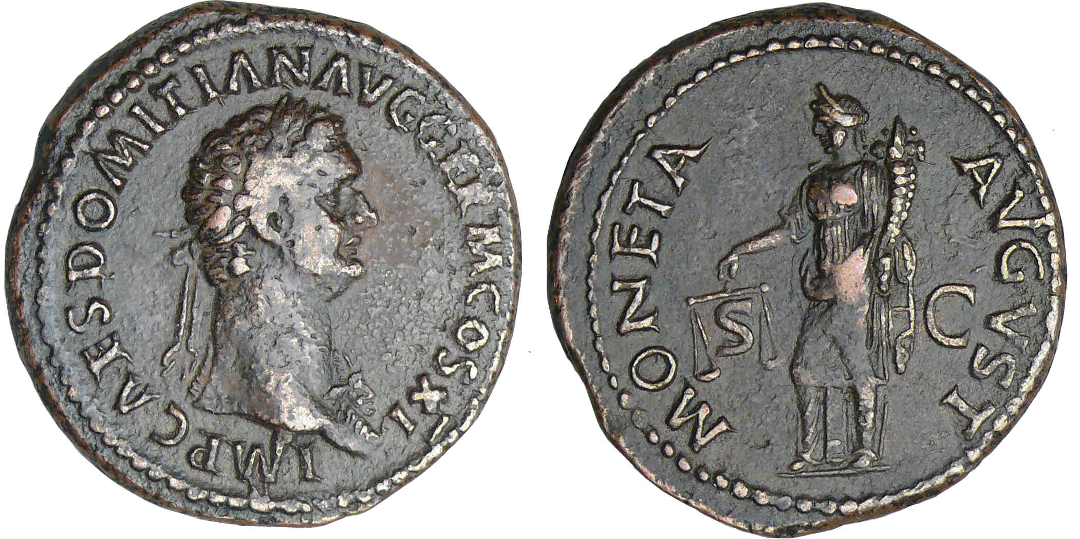 R/ MONETA AVGVSTI SC. La Monnaie debout à gauche, tenant une balance et une corne d’abondance.