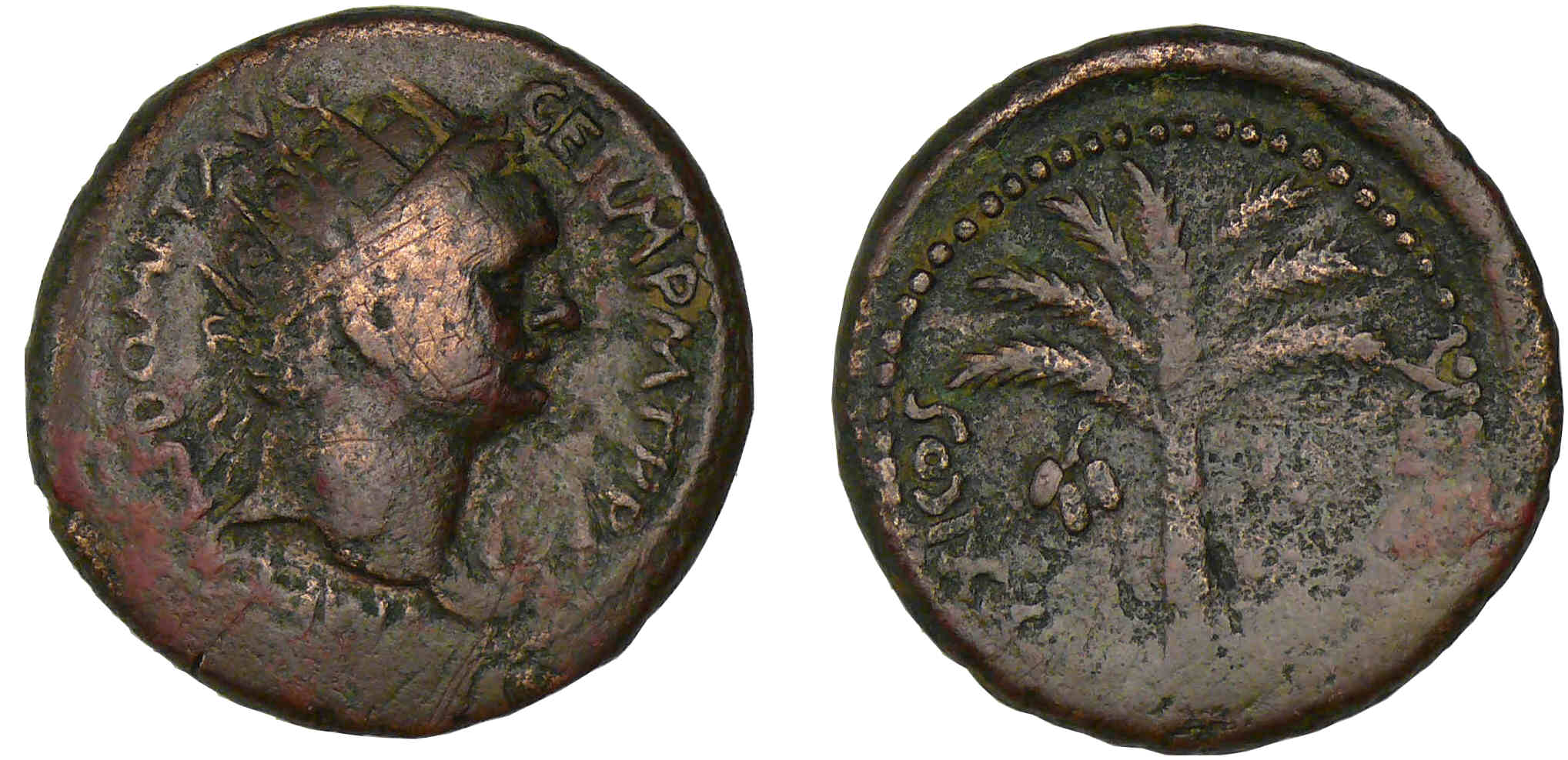 Observation : Cette monnaie est très rarement proposée à la vente. C’est la seule monnaie du règne de Domitien en lien direct avec la Judée par le biais du palmier.