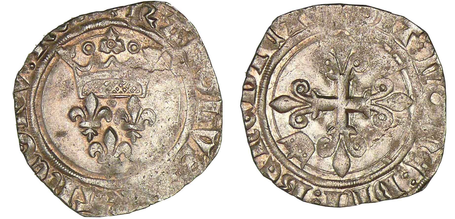 A/ + KAROLVS:FRANCORV:REX. Trois lis posés sous une couronne trèflée.