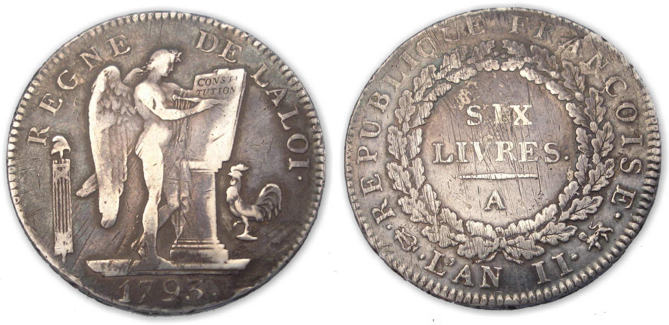 Avers : A/ REPUBLIQUE FRANÇOISE. / (Mg). L’AN II. (Mm). SIX / LIVRES. / – / (atelier), en trois lignes dans le champ, dans une couronne de chêne.