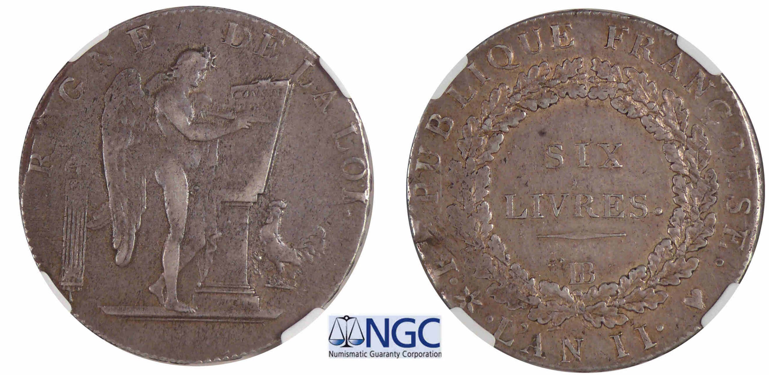 Revers : R/ REPUBLIQUE FRANÇOISE. / (Mg). L’AN II. . SIX / LIVRES. / – en trois lignes dans le champ, dans une couronne de chêne.