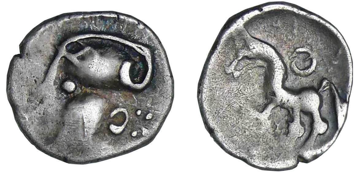 R/ Cheval libre galopant à gauche. Un annelet au-dessus et un en-dessous.