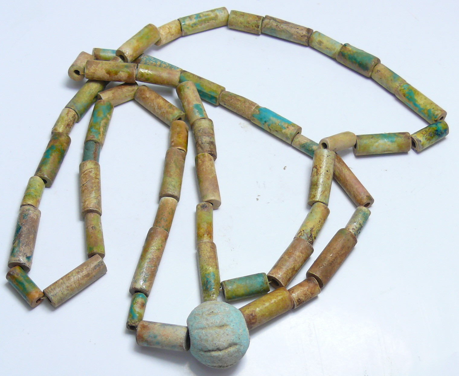Grand collier en perles tubulaires en stéatite avec une perle bleue représentant un bourgeon de fleur de lotus en fritte. 660 mm.