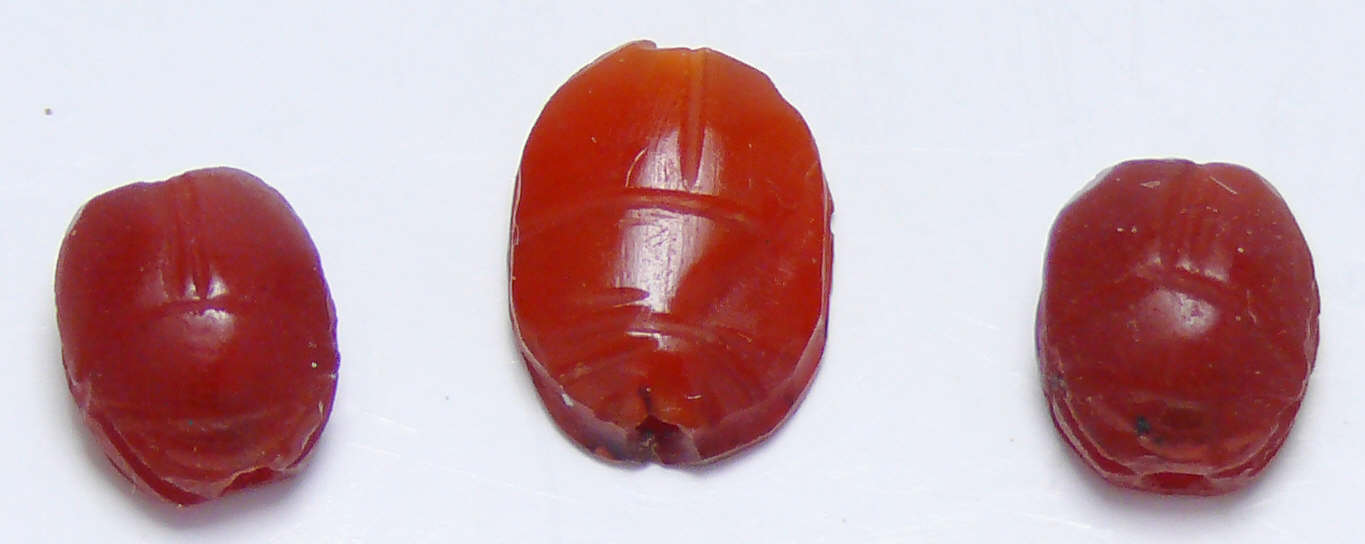 Lot de 3 scarabées en cornaline rouge. Dimensions : de 10 à 12 mm.