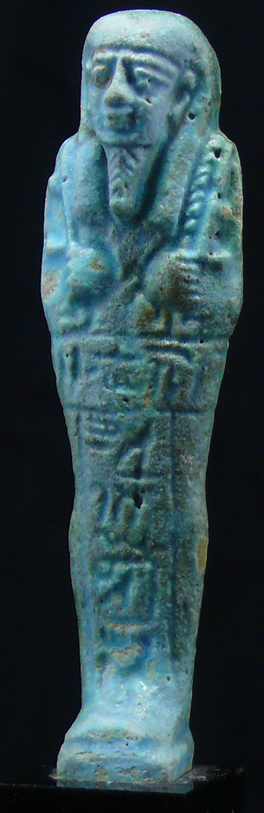 Grand et bel oushebti en fritte émaillée bleu ciel orné de 2 lignes de hiéroglyphes en forme de T. Dimension : 110 mm.