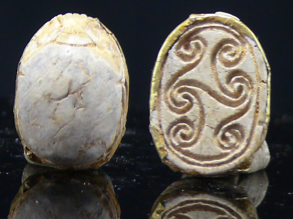 Avers : Scarabée en calcite blanc avec un reste de cerclage en or et décoré de 2 volutes. Dimensions : 16 * 11 mm.