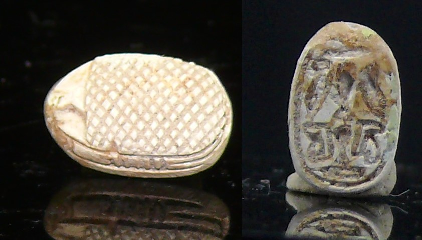 Scarabée en calcite blanc décoré de hiéroglyphes. Dimensions : 12 * 8 mm.