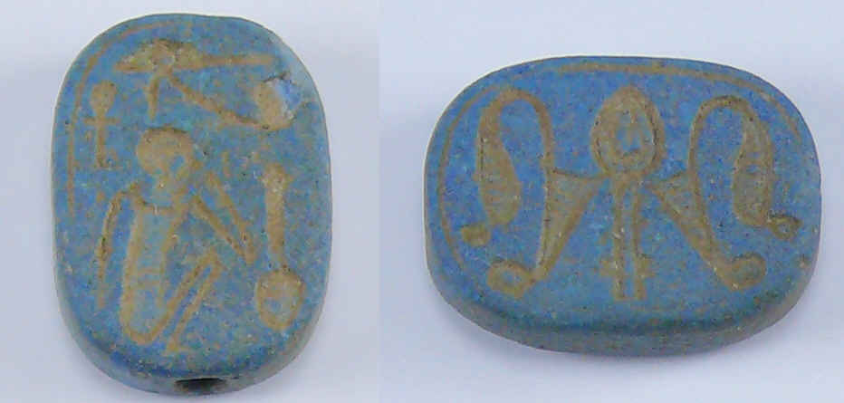 Avers : Scarabée en fritte bleue représentant d’un côté un personnage agenouillé entouré d’un œil oudja et d’un ankh (croix) et 2 cobras de l’autre. 13 mm de longueur.