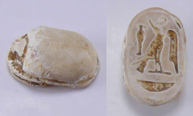 Scarabée en stéatite blanche gravé d’un faucon et d’une plume. 14 mm.