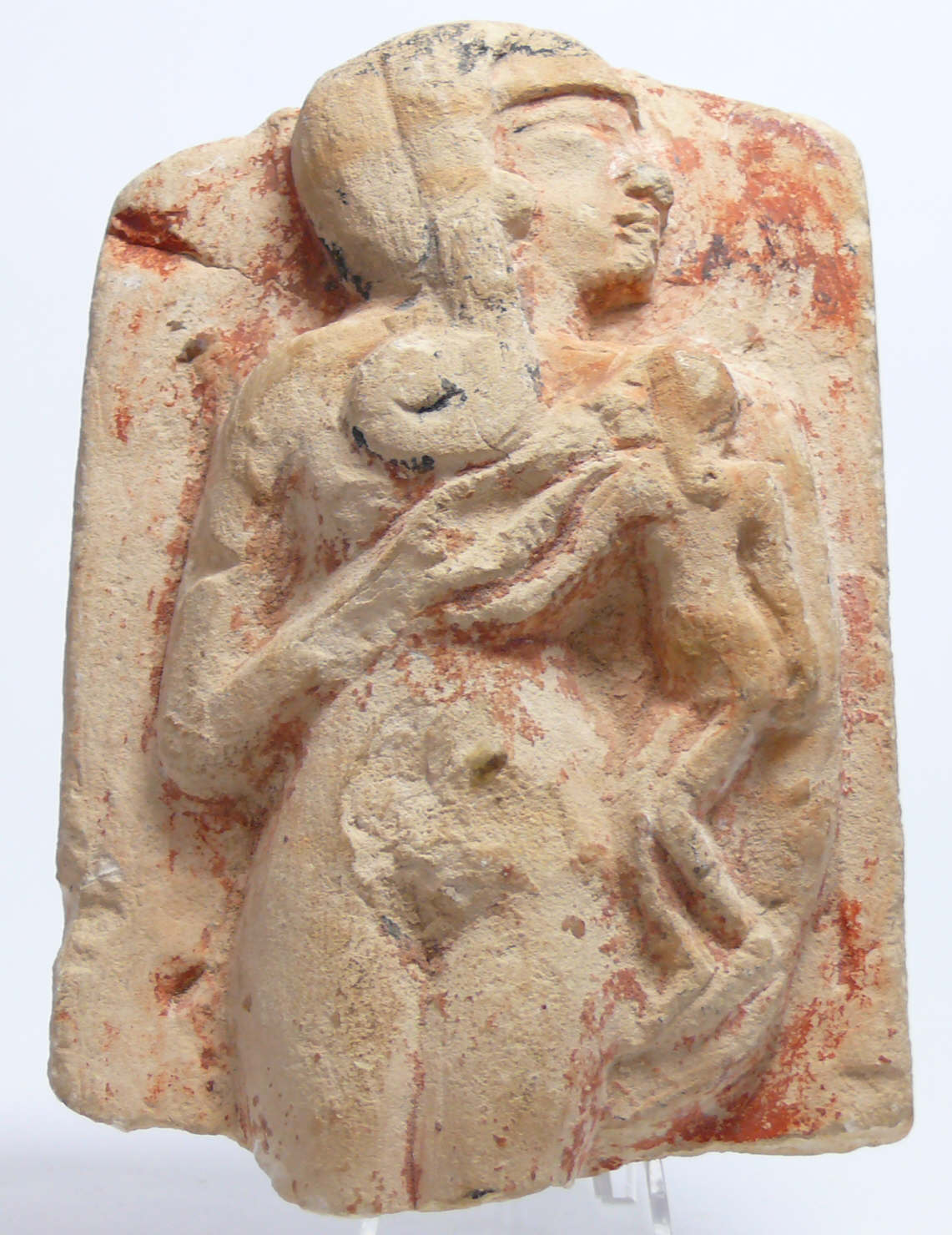 Avers : Bas relief ou plaquette en terre cuite avec la représentation d’une femme allaitant un enfant. Dimensions : 135×90 mm.