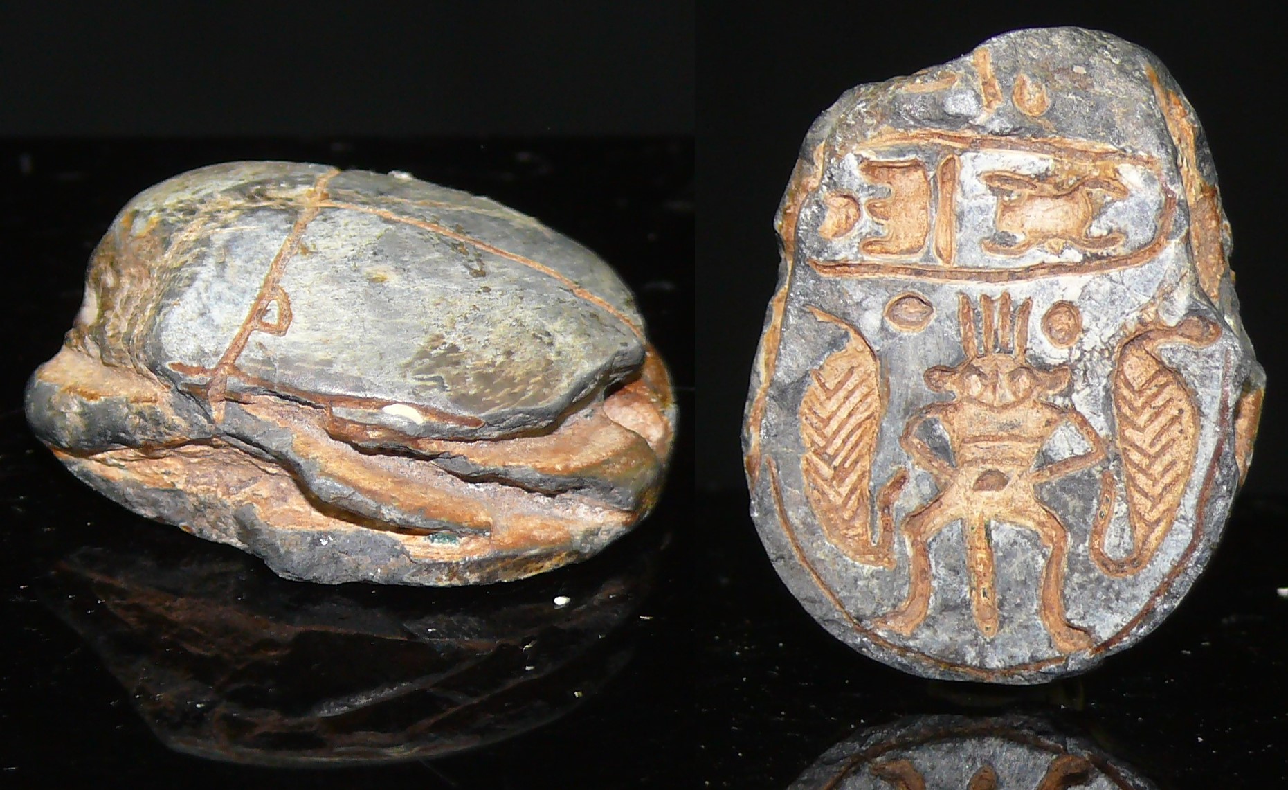 Avers : Grand scarabée en pierre de couleur grise dont l’empreinte représente le dieu Bès entouré de 2 cobras et surmonté d’un cartouche pharaonique au nom de Thoutmôsis III. Dimensions : 33 * 24 mm.
