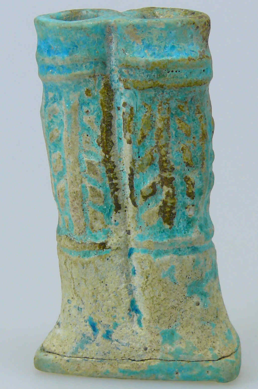 Avers : Vase double à onguents sur pied, de couleur bleue. Traces de restauration au pied de l’objet. 55 mm.