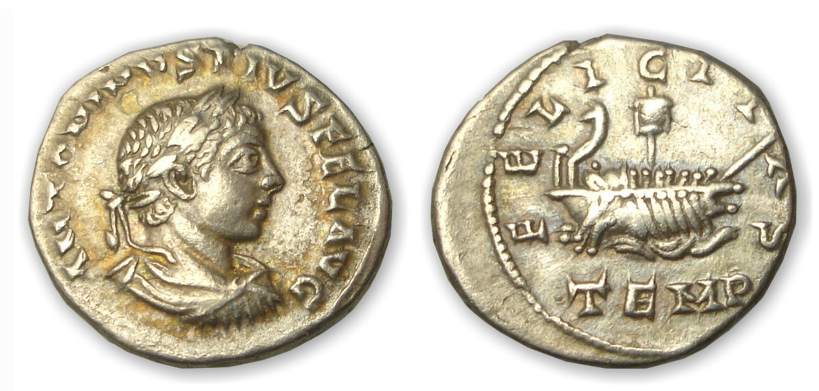 R/ FELICITAS // TEMP Vaisseau avec sept rameurs et un pilote allant à droite. La poupe est ornée d’une enseigne et d’un acrostolium et la proue d’un mat penché.