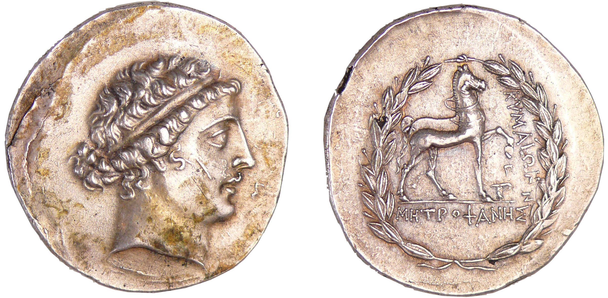 Revers : R/ ΚΥΜΑΙΩΝ // ΜΗΤΡΟΦΑΝΗΣ. Cheval au pas à droite, levant l’antérieur gauche au-dessus d’une coupe à une anse. Le tout dans une couronne de laurier.