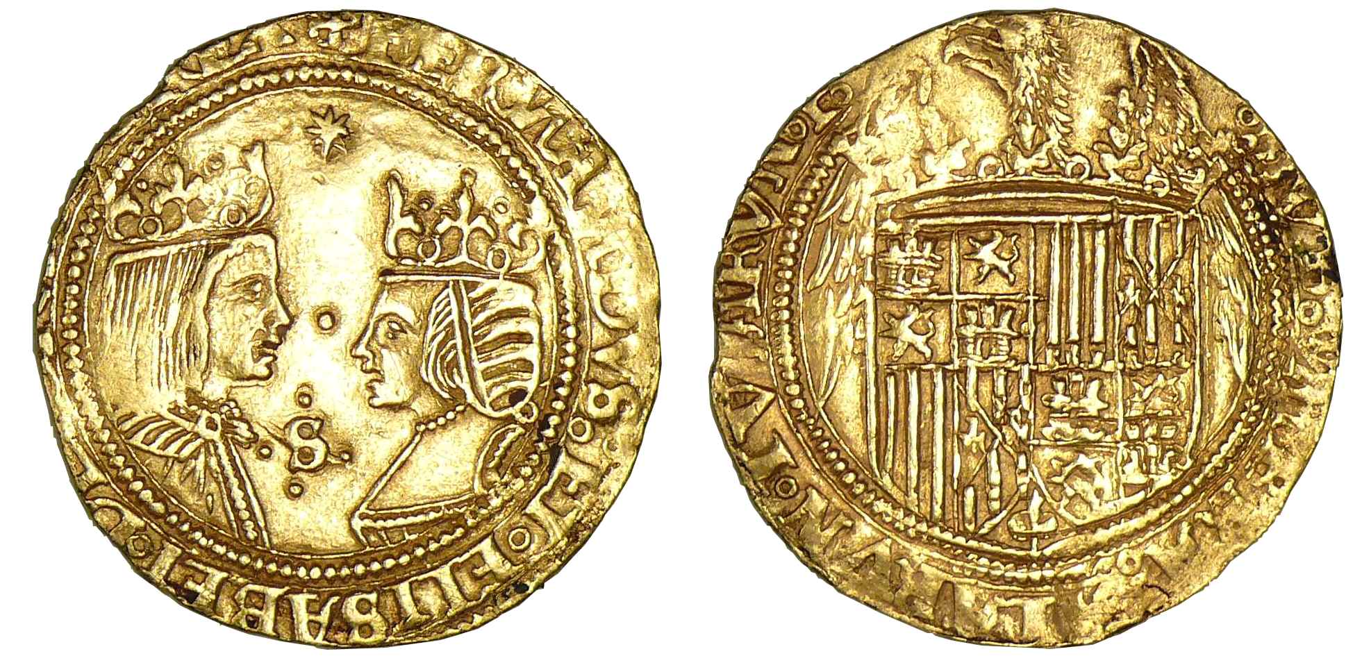 Avers : Ferdinand V et Isabelle (1469-1504). A/ FERNANDVS: ET: HELISABET: DEI: GRA. Bustes affrontés de Ferdinand et Isabelle. Une étoile et un S entre quatre points dans le champ.